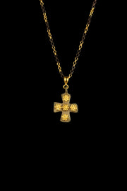 An ancient bronze cross enhanced with delicate gold work, blending historic charm with elegant craftsmanship.